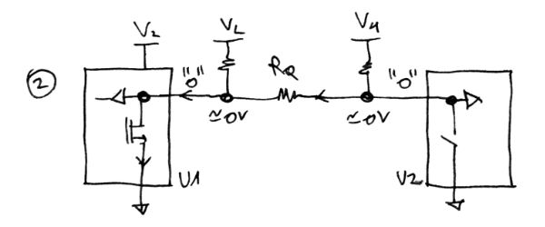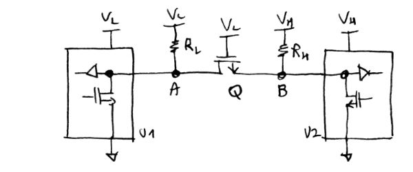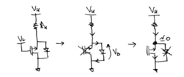 - Commercial FETs are not symmetric. There are several differences between the source and the drain. The biggest difference, as far as this circuit is concerned, is the presence of the body diode. Off-the-shelf transistors usually have the body shorted with the source, and this is represented by a diode in antiparallel with the drain and the source. Figure 4 shows the equivalent circuit when $U_1$ transmits a zero. When $U_1$ pulls A low, the diode turns on first and the voltage across the FET is $V_D$. The FET goes from saturation to ohmic region and causes the diode to turn off. However, if $R_H$ is too small or the FET is too weak, it is possible that the diode never turns off and the FET stays in saturation. This could cause thermal problems for the FET and, more importantly, could make $U_2$ misinterpret the voltage at B ($V_D$) for a logic high. Make sure you size both the resistors and the FET to guarantee that the body diode always turns off.