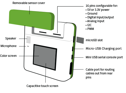 The evaluation kit is focused on usability more than performance: the hardware is loaded with color touch screen, microphone, speaker, Wi-Fi, Bluetooth, bunch of programmable I/O pins and a nice looking case (see pictures). Compared with the Pi, the Kinoma Create has much less raw computational power with its single-core 800MHz Marvell ARM SoC, only 128MB of RAM and a small 16MB of Flash memory (as a comparison the latest Pi sports a 900MHz Quad-Core ARM CPU, 1GB of RAM and allow for external SD card for permanent storage) but this is exactly what the Kinoma Create wants to be: a powerful enough demo-board with lots of embedded sensors, able to run a low-footprint embedded Linux with a custom-version stripped-down JavaScript engine. The idea is to have makers prototype their idea on something more likely to represent a realistic reference schematic for a final product. The BOM cost of the hardware (excluding case and screen) should be south of $10 for orders in the thousands, no exact figures have been provided.