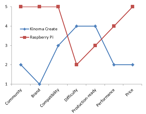 This seems an awful lot similar to Raspberry Pi… how do the two compare with each other? I asked myself the same question… as a user, I can think of seven things I care about in a board like this (in order of importance): existence of a strong community, the brand (meaning: have I ever heard of it? How many other people use it? Is this going to be around in the foreseeable future?), compatibility with external hardware, difficulty of usage (e.g. required Linux skills), complexity to convert to production hardware, performance and price. Here how I think Kinoma Create and Raspberry Pi compare (this is all qualitative and based on my opinion):