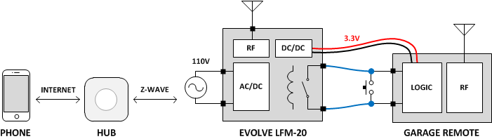 To activate the remote controller, I connected an Evolve LFM-20 dry switch in parallel to its mechanical push-button, so that when the LFM-20 relay is closed, the push button would become a short circuit as if someone had pressed it. Note that this does not compromise the functionality of the push button which can still be used for manual operation. The LFM-20 is in turn operated by the SmartThings hub, which is commanded by my smartphone.
