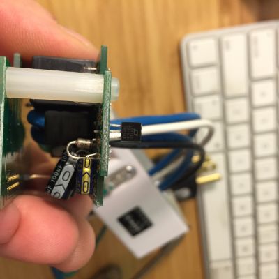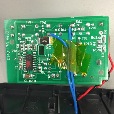 The LFM-20 uses AC power to generate its own DC voltage while the remote controller uses a battery. Having a system where some parts run on AC power and others from a battery is not very elegant. Therefore, I decided to steal some of the DC power from the dry switch to supply the remote controller as well. Luckily enough, its internal logic works at 3.3V, the same as the remote battery. The remote controller current consumptions during transmission amounts to less than 5% of the capability of the LFM-20 internal regulator (a LT1121-3.3, capable of delivering 150mA) so it is possible to steal the required current without overloading it. To improve things, I added a small RC filter to decouple the two devices and limit the maximum current between them.